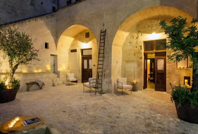 Le camere sono rigorosamente monocromatiche, caratterizzate da tonalità castane che vanno dal beige della pietra al marrone del legno e del ferro cortèn. La terra, la chianca, il colore naturale della pietra diventano parete, soffitto e seduta. La ricerca costante di un legame tra gli ambienti interni e il paesaggio circostante ha dato vita al gioco della mescolanza della pietra locale, del legno e del ferro che si ripete in ogni camera con differenti proporzioni seguendo un disegno lineare ed essenziale. Elementi poveri, solitamente associati ad uno stile rustico, assumono leggerezza e modernità. Una luce intensa filtra dalle porte d’ingresso, sapientemente lavorate a mano, che attraverso le chiare tende di lino invade il primo ambiente di ogni camera destinato a salotto e area relax. Merita una menzione speciale la Suite con Spa privata, un luogo affascinante dove il tempo si ferma e la pietra racconta, dove poter vivere la magia dei "Sassi" in una suite pensata per rigenerare corpo e anima.