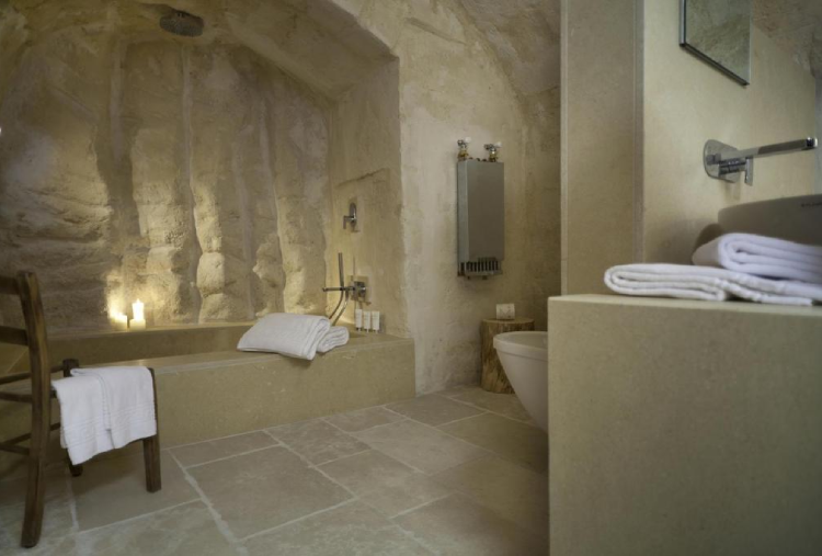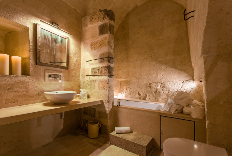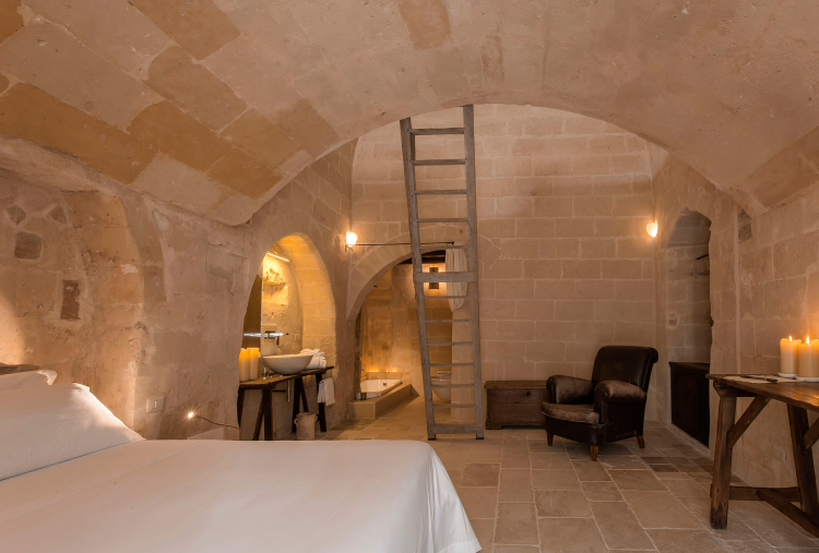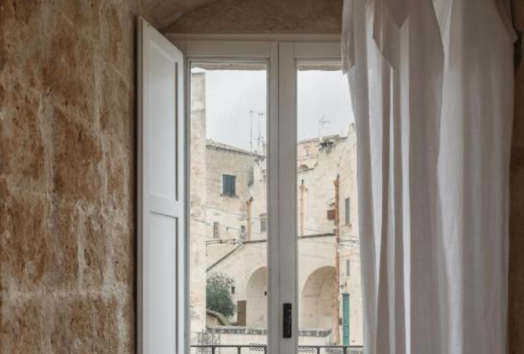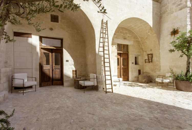 Nel cuore degli antichi Rioni Sassi, alcune strutture abbandonate e in disuso, risalenti al 1600, sono state restaurate e reinventate per accogliere i nuovi spazi di un Borgo Albergo Diffuso: Corte San Pietro. Sono state eliminate le superfetazioni, le contaminazioni, gli strati di pavimentazioni più recenti ed è stata messa in luce la trama delle antiche murature in tufo sormontate da volte: la struttura storica è stata messa a nudo, e assunta come testimonianza architettonica con cui confrontarsi e dialogare. I luoghi storici, densi di una seduttiva identità, si coniugano con armonia e rigor
